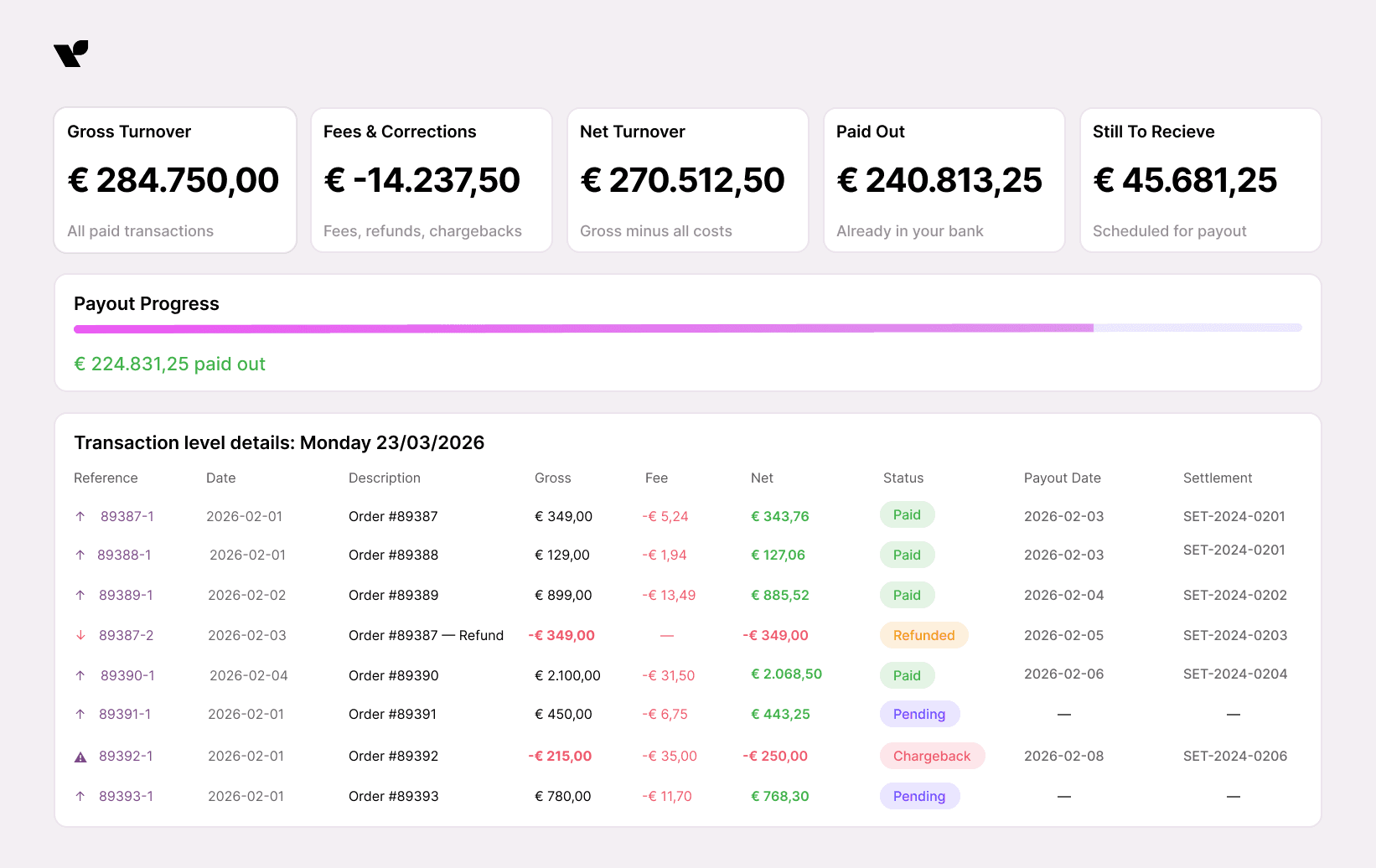 One settlement report. The full story: every payment, fee, chargeback, refund, and payout from a single source, fed directly into your dashboard: