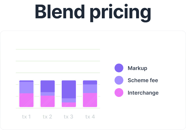 Blended pricing offers a flat or percentage rate per transaction, typical for alternative and bank-based methods. For cards, this means the same pricing no matter the card type.