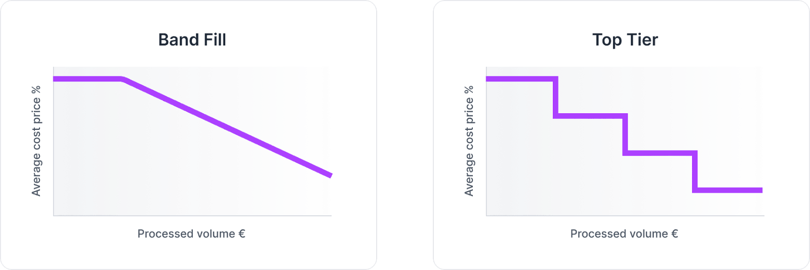 If you expect strong growth in payment volume, consider negotiating a top-tier pricing model. Under this model, once you reach a specific volume tier, the rate for that tier applies to your entire transaction volume, not just the portion within that tier. This is different from band-fill pricing, where only the volume within each tier benefits from the corresponding rate.